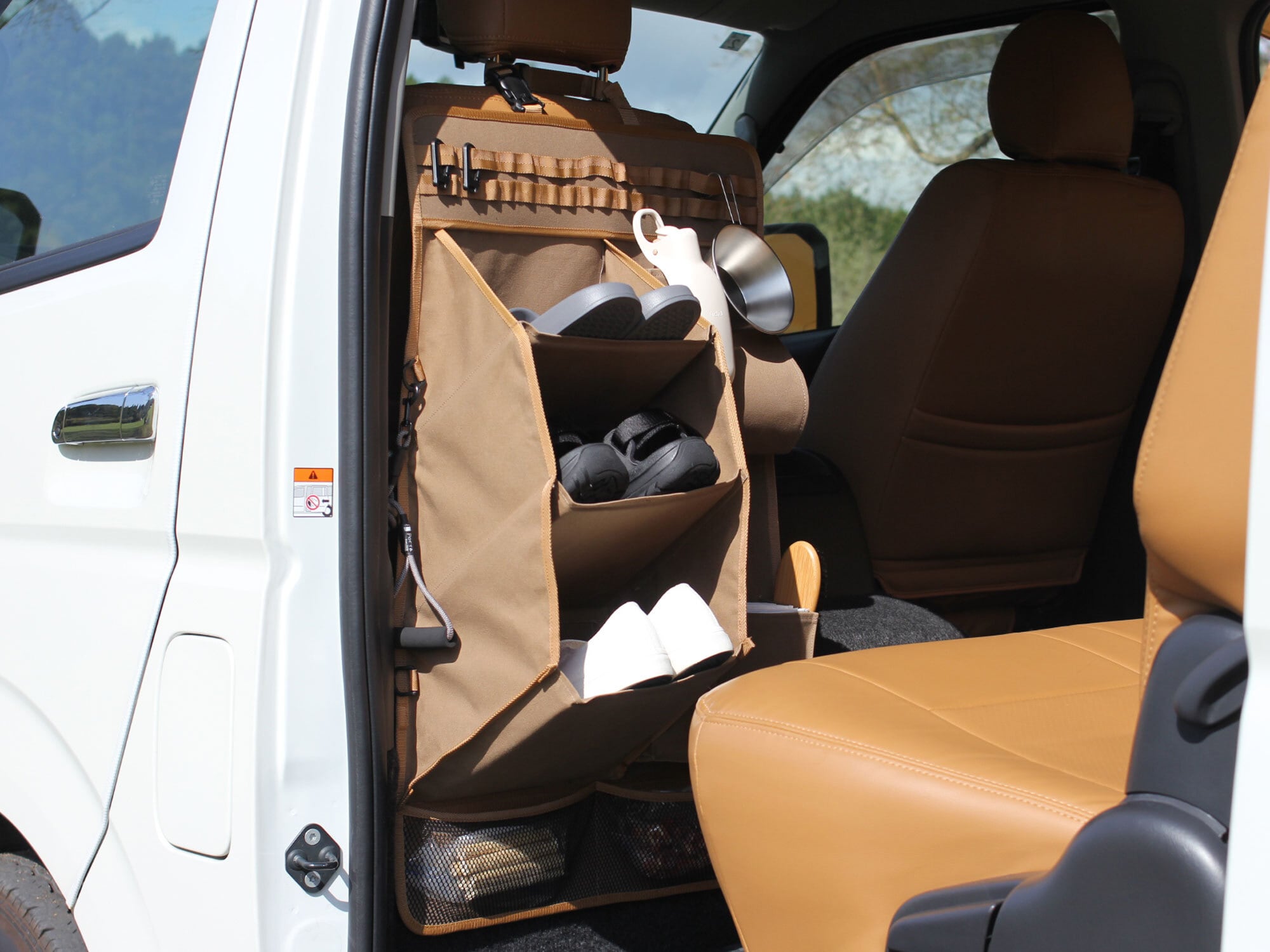 愛犬との旅や車中泊に適したポケットや収納を備えています。